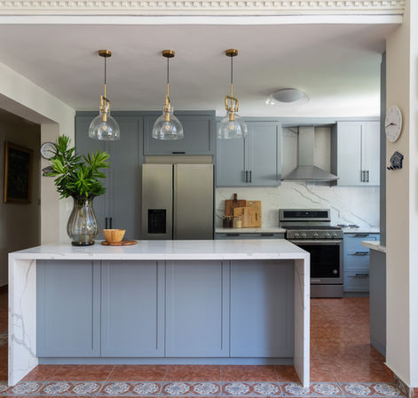 En nuestro proyecto de cocina, hemos logrado fusionar lo clásico con lo contemporáneo de manera excepcional, adaptando la cocina al espacio y estilo preexistentes de la vivienda. La elección de una encimera y backsplash de cuarzo se revela como un elemento central y distintivo, especialmente en la isla de la cocina. Optamos por un cuarzo veteado en tonos grises azulados, armonizando a la perfección con los muebles de tono azul grisáceo. Este matiz de azul se integra de manera sublime con los cálidos tonos terracota del suelo, creando una combinación visualmente cautivadora. Para añadir un toque de elegancia, seleccionamos tiradores negros que complementan a la perfección el conjunto de muebles. El resultado es una cocina que no solo es funcional y práctica, sino también un espacio estéticamente refinado que invita a disfrutar de momentos culinarios únicos.