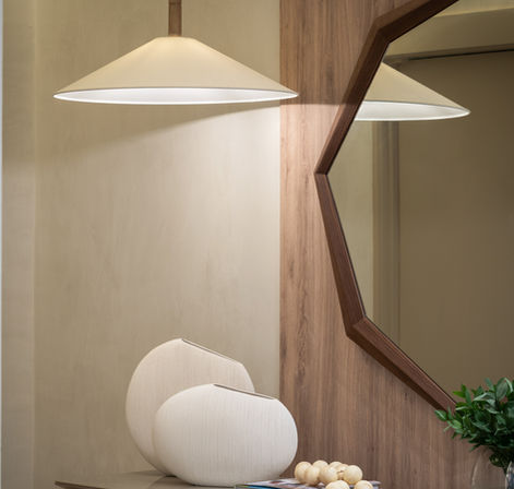 Una vivienda diseñada para respirar calma: luz indirecta que abraza el techo, panelado en madera que arropa el sofá y una paleta neutra en capas. La composición se ordena con una obra abstracta suave y un boiserie crema que recorre el perímetro, aportando ritmo clásico a una arquitectura más contemporánea.