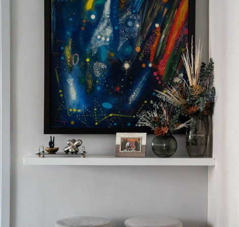 Este proyecto cuenta con sala comedor integrada, espacio de estudio y balcón donde trabajamos con una paleta de colores en crema y acentos en madera, metales dorados y tonos de azul. En la pared que comparten estos dos espacios integramos molduras de madera con textura de papel decorativo.