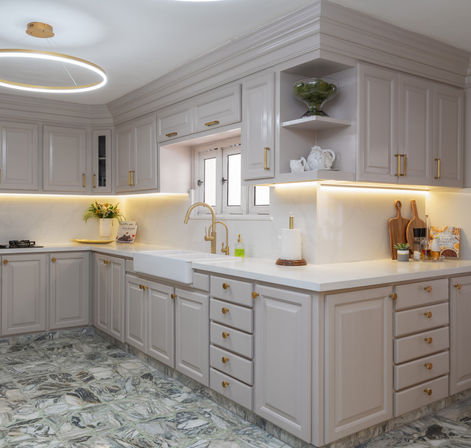 En esta casa trabajamos en la intervención y readecuación de la cocina, pero también hicimos una remoción del área de terraza y ½ baño. La visión era lograr actualizar el aspecto de la cocina y adaptarla a las nuevas necesidades de la familia. Una parte importante en el proceso fue iluminar y aclarar el espacio ya que cuenta con poca luz natural así que decidimos trabajar con una paleta de colores cremas e integrar topes y backsplash en cuarzo blanco. Dos aros de led con base dorada iluminan el espacio y se complementa con luz de trabajo integrada en toda la superficie de los gabinetes aéreos. Una solicitud importante era generar espacio de almacén para la colección de vajilla, así que integramos un área de almacén con vitrina y puertas de vidrio iluminadas con chanel led. Estilizamos con detalles decorativos e integramos tiradores y accesorios dorados complementan la estética del espacio.