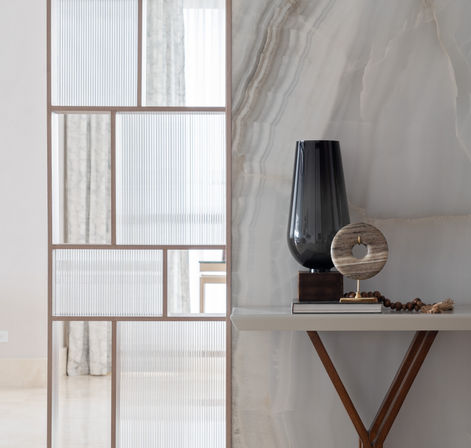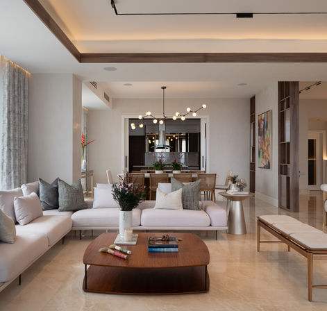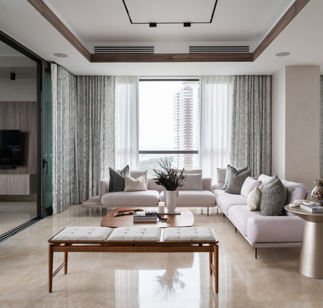 Esta residencia se define por su estilo contemporáneo con influencias minimalistas, donde se destaca la selección de materiales de alta calidad y piezas únicas que aportan distinción. En un diseño semiabierto, se ha logrado separar visualmente la zona de entrada sin comprometer la sensación de amplitud, logrando una transición fluida entre los diferentes espacios. Se han diseñado separadores de ambientes con partes huecas y traslúcidas para permitir el paso de la luz, enmarcando dos piezas de cuarcita con un efecto "bookmatch" que añade un toque de sofisticación. Esta área se fusiona de manera armoniosa con la zona de estar y el comedor, ofreciendo diversas oportunidades de interacción. Además, se ha creado un espacio adyacente a la sala principal que promueve encuentros informales y proporciona mayor capacidad para los residentes. En la zona de TV, se ha integrado un sofá en tono verde salvia, que dentro de la paleta de colores verdes, aporta frescura sin comprometer la armonía con el resto de la decoración. La habitación principal combina elementos clásicos y modernos, evocando una elegancia atemporal.