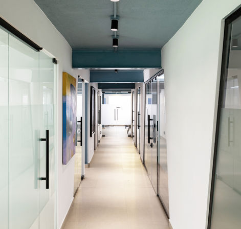 El concepto fue crear un espacio contemporáneo con el uso de líneas rectas, perfiles negros que aportan un detalle industrial junto con cortes diagonales en las divisiones de vidrio que aportan un interesante patrón arquitectónico a los pasillos de circulación. Trabajamos los techos resaltando los elementos estructurales y dejándolos visibles, integramos luminarias indirectas de led y chanels empotrados y de superficie para las áreas de trabajo. Los pisos de madera aportan calidez a los diferentes espacios. Acentos de color azul en techos y mobiliario, cuadros y arte aportan color a los espacios.